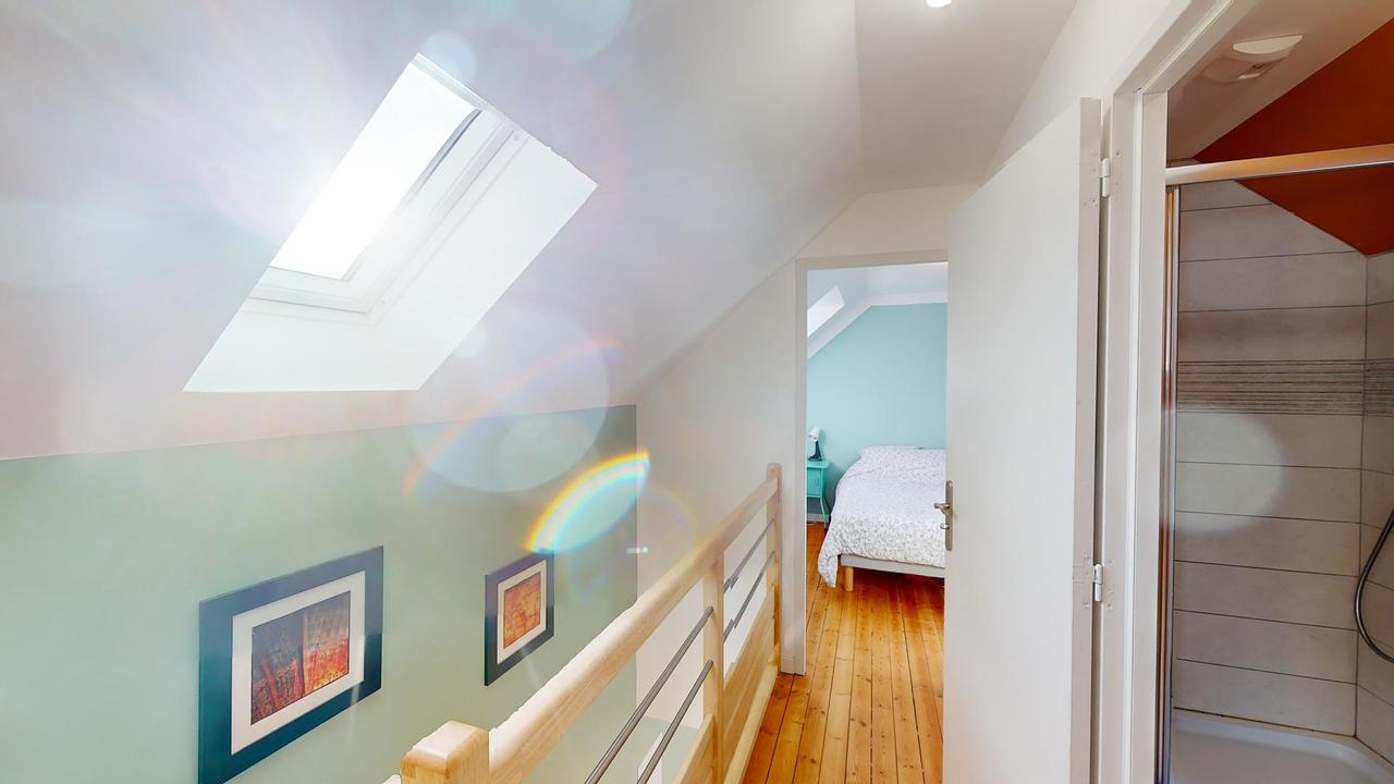 Au premier étage, la salle d'eau dispose d'une grande cabine de douche, d'un miroir plain-pied, d'un meuble double vasques et d'un porte-serviettes radiateur. Les toilettes sont séparées. La maison dispose d'une machine à laver et d'un sèche-linge.
