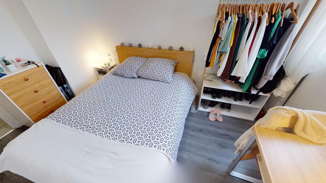 La chambre 3 de 10m2 adjacente à la pièce de vie est lumineuse. Cette chambre comporte un lit double, un bureau, une chaise et des rangements.