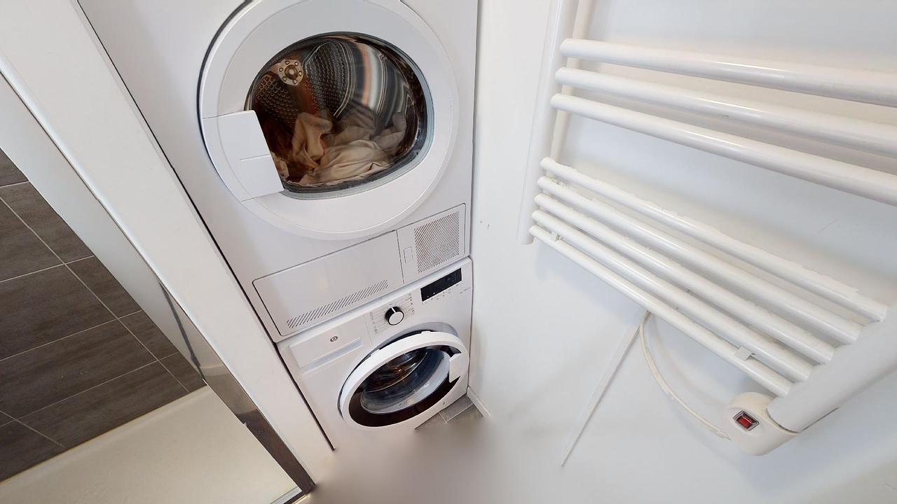 Une salle de bain avec douche, machine à laver, sèche linge et meuble vasque ainsi que des WC séparés viennent compléter ce logement.