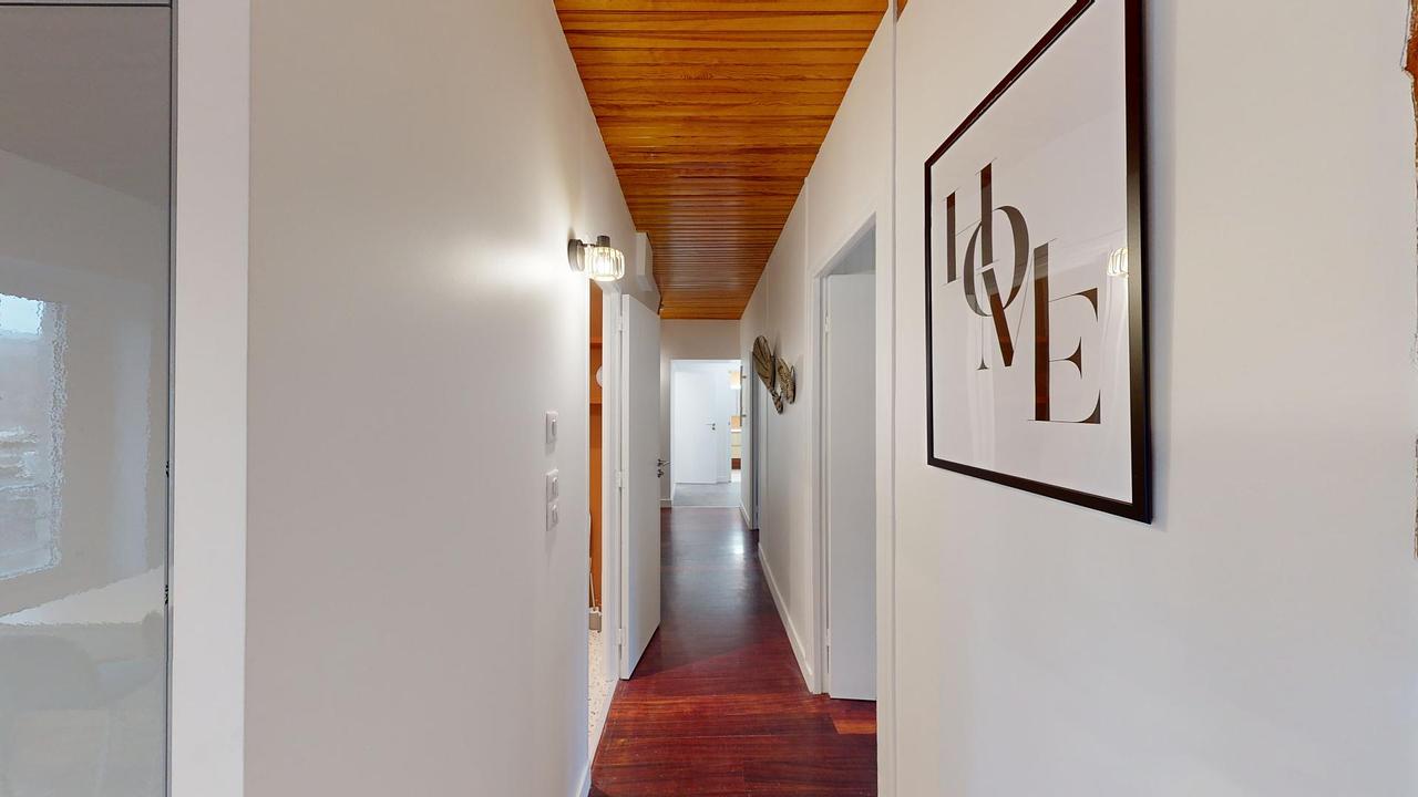 Cet appartement de 5 pièces s'organise comme suit : un salon avec deux canapés, une table à manger ainsi qu'une télévision, une cuisine, une salle de bains et trois autres chambres.