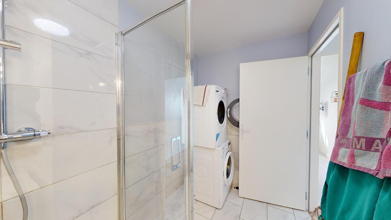 La deuxième salle de bain est équipée d'une douche, d'une vasque, ainsi que d'un lave-linge et d'un sèche-linge.