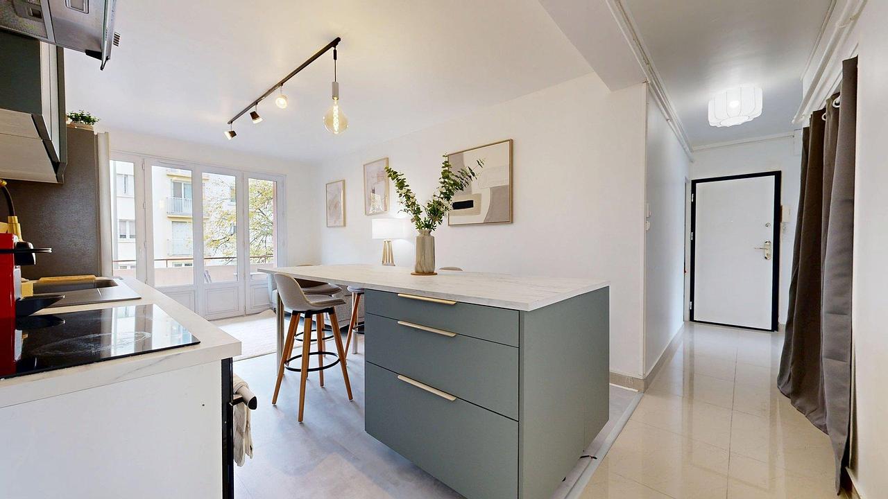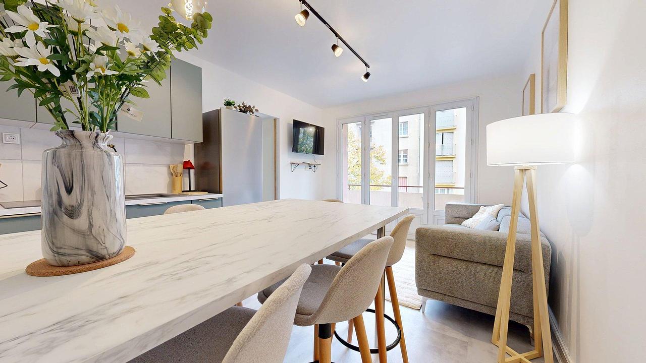 Entièrement rénové et décoré avec soin, ce bel appartement traversant propose un espace de vie lumineux et convivial. Le séjour, aménagé avec un canapé confortable et une décoration moderne, s’ouvre sur une cuisine ouverte au design contemporain.