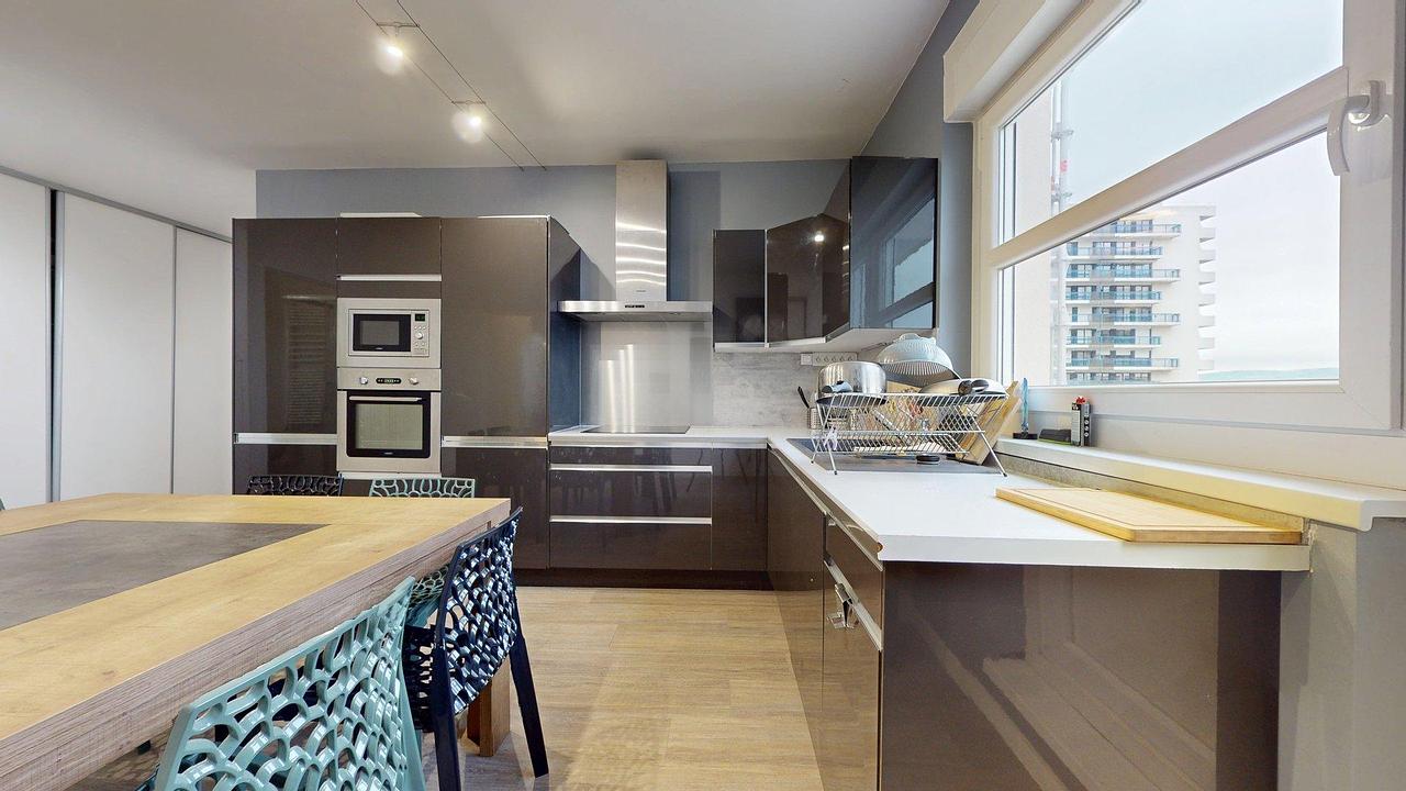 La cuisine, moderne et entièrement équipée, comprend un four, un micro-ondes, un lave-vaisselle, ainsi que de nombreux ustensiles et rangements.