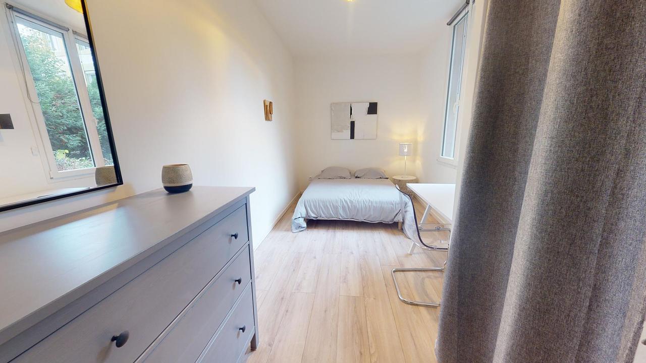 3 chambres sont présentes avec lit double, bureau, rangements.