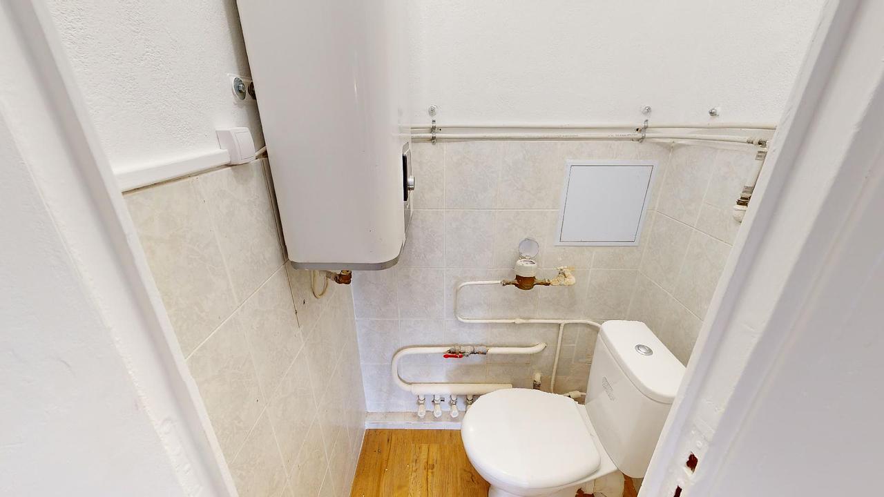 La salle d'eau est équipée d'un meuble vasque et d'une douche, et il y a également des toilettes séparées.