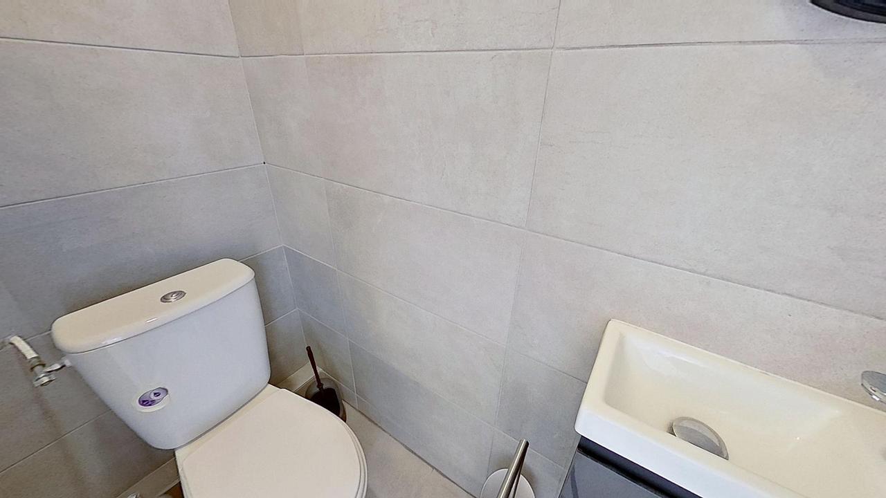 Cette colocation de trois chambres s'ouvre sur la pièce de vie avec la cuisine ouverte. Cette dernière est équipée d'un réfrigérateur avec congélateur, des plaques de cuisson avec une hotte, un micro-ondes, une bouilloire, un mixeur, un grille-pain, une machine à laver, un évier avec un égouttoir ainsi que de nombreux rangements. Un mange-debout avec quatre chaises hautes viennent compléter cette pièce. Le salon est aménagé d'un canapé, de deux tables basses, une banquette ainsi qu'une télévision.
