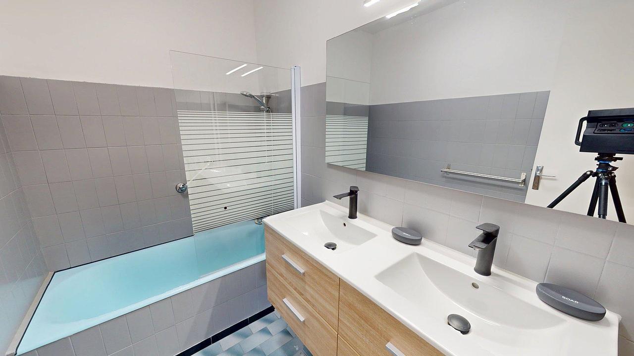 Salle d’eau moderne : équipée d’une douche, d’un meuble vasque avec miroir et de rangements pratiques pour vos effets personnels.