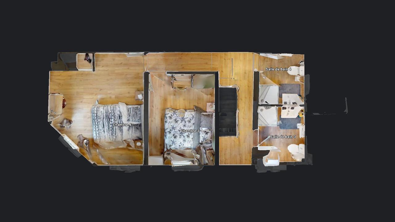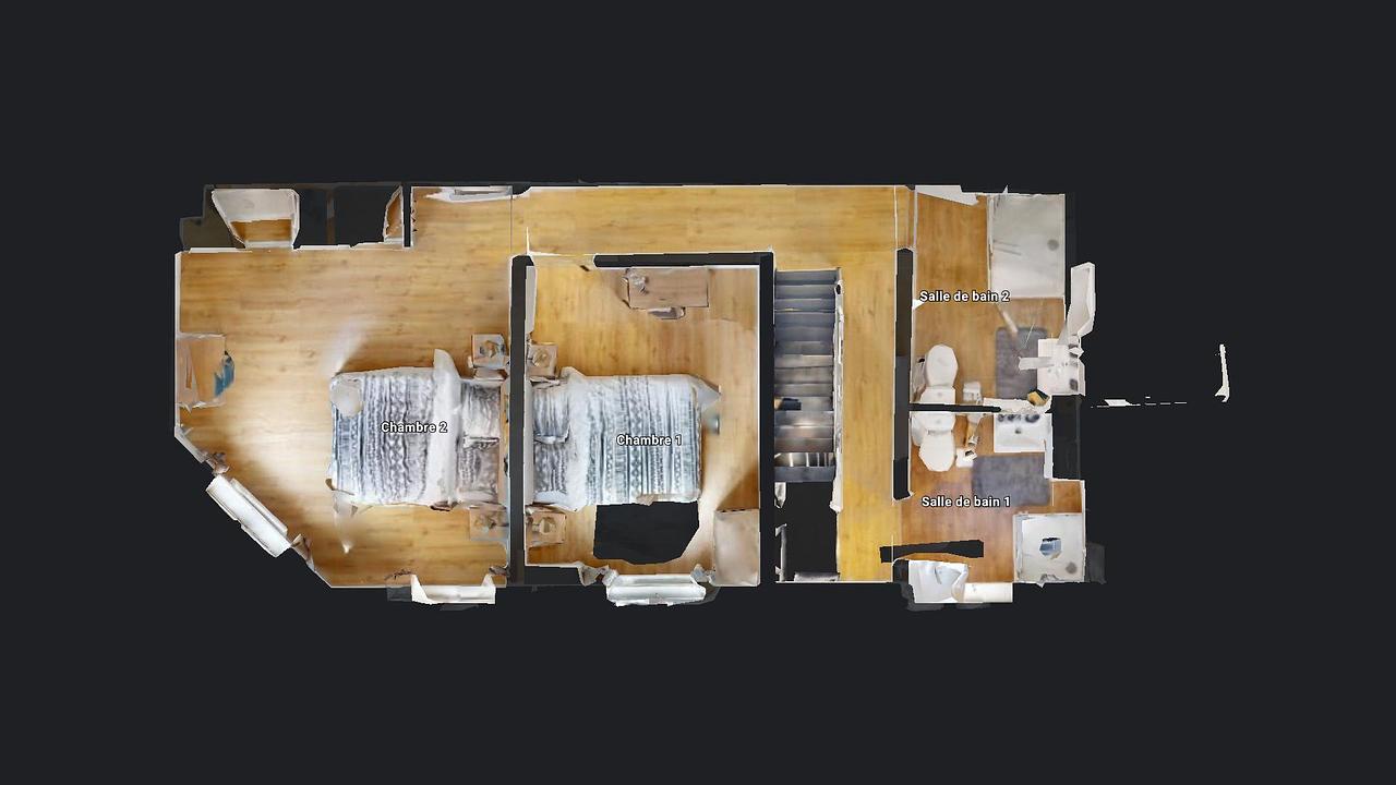 Deux des chambres se trouvent au 1er étage qui comporte deux salles de bains chacune comprenant une cabine de douche, des toilettes, un meuble vasque avec un rangement miroir. Il s'agit de la même organisation avec le deuxième étage.