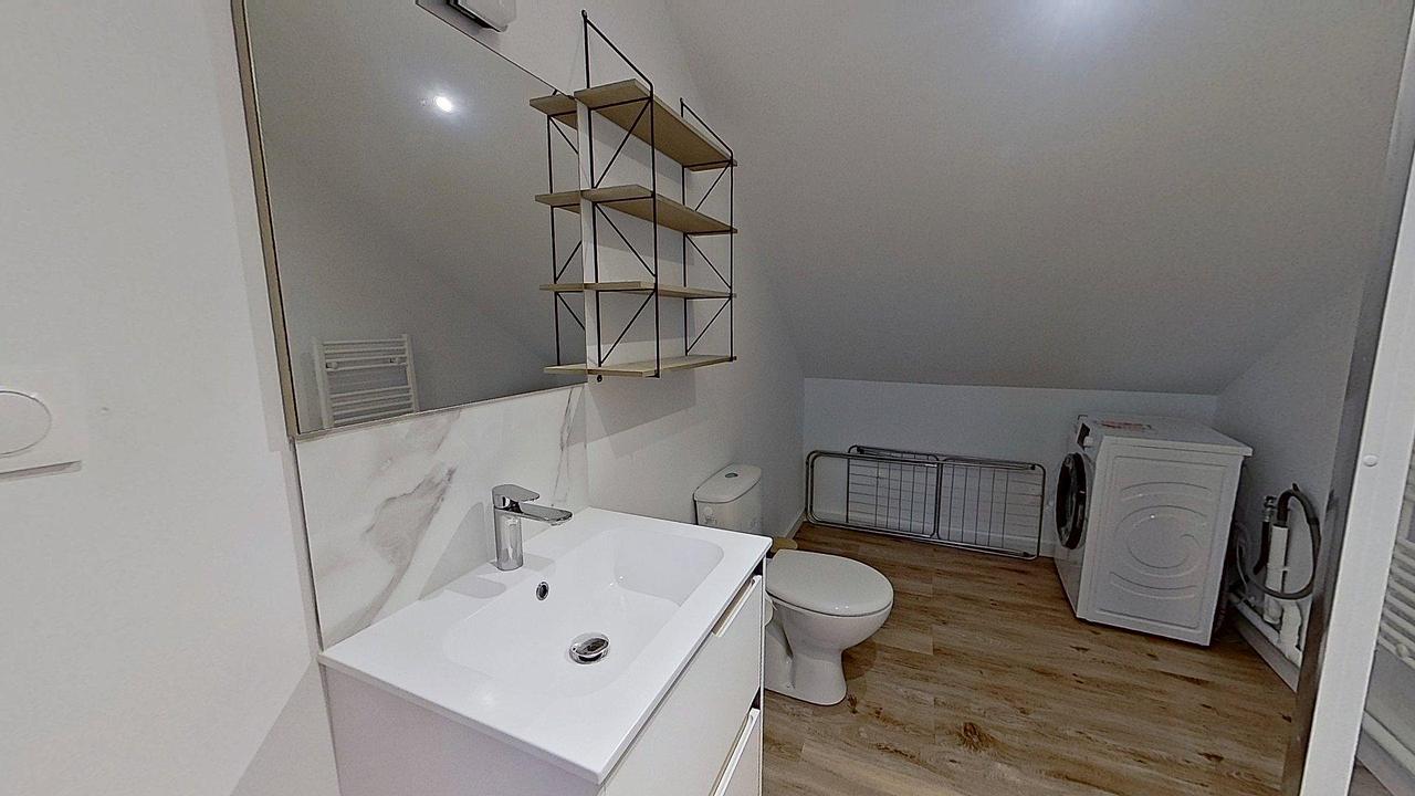 À l’étage, deux salles de bain modernes avec meuble vasque, douche, sèche-serviette et machine à laver.