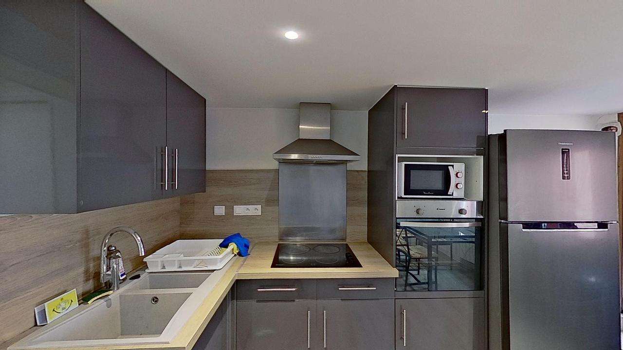 Le séjour est meublé avec table à manger, TV et meuble TV. La cuisine s'équipe avec frigidaire compartiment congélateur, plaques de cuisson et hotte, four et micro-ondes, ainsi que de nombreux rangements et ustensiles de cuisine.