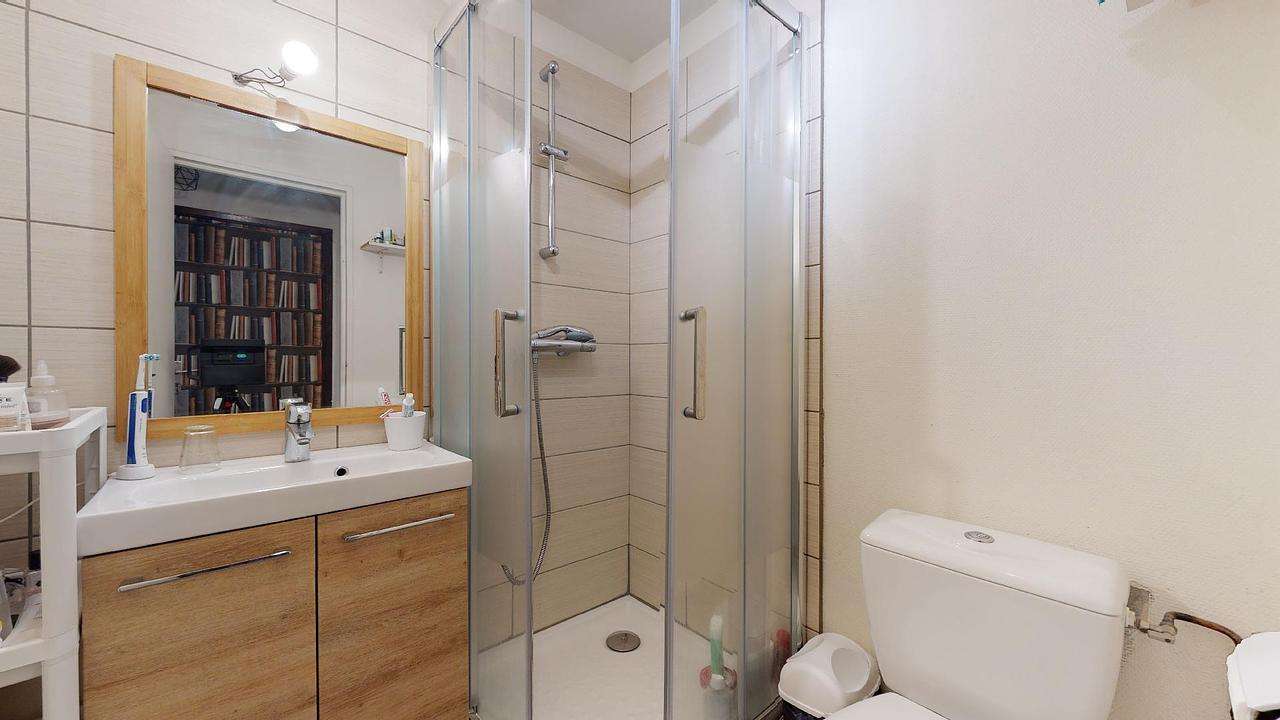 La porte d’entrée de ce studio s’ouvre sur un sas avec un grand placard de rangement et la salle de bain avec douche, meuble vasque et WC.