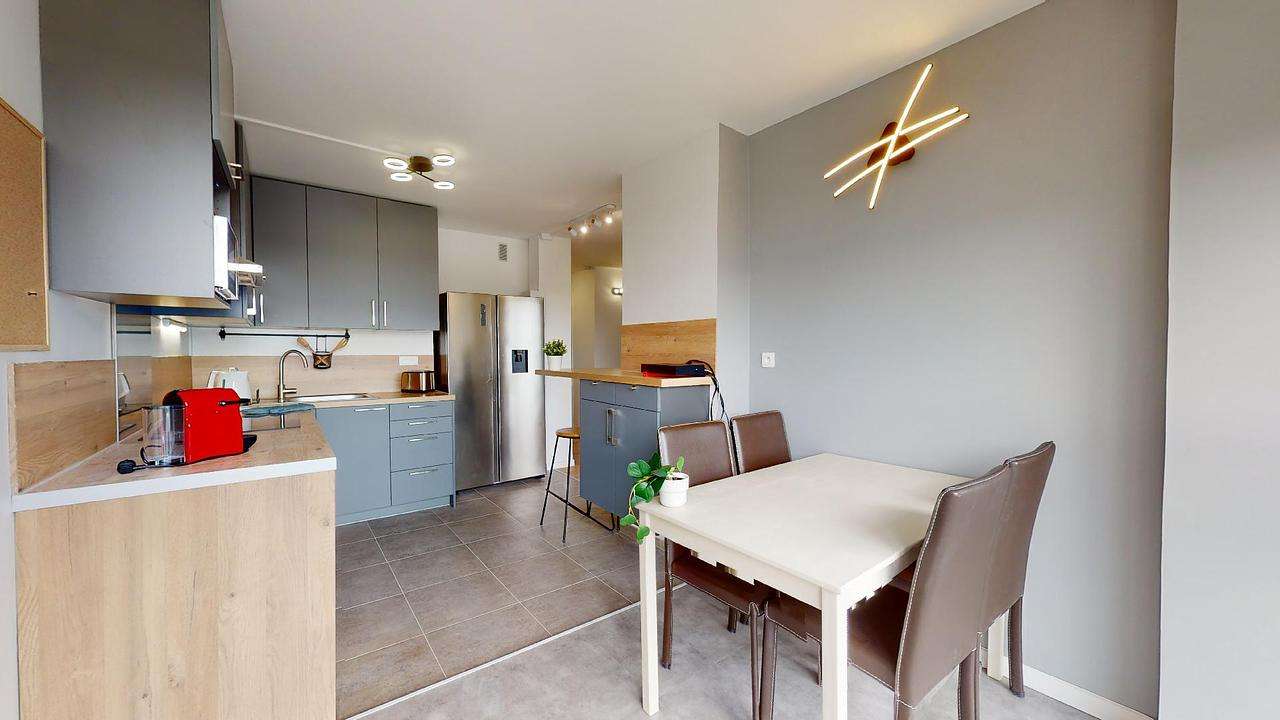 Cet appartement se compose d'une belle cuisine aménagée et équipée : lave-linge, four, plaques de cuisson, machine à café, hotte, micro-ondes, grille-pain et un réfrigérateur américain ! Elle est ouverte sur un coin repas et dispose en plus d'un bar.