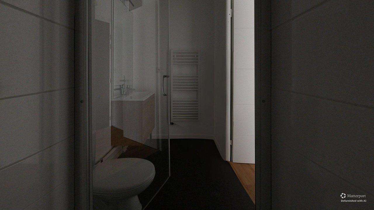 La salle d’eau comprend une douche spacieuse, un meuble vasque avec miroir, un WC, un sèche-serviette et des rangements.