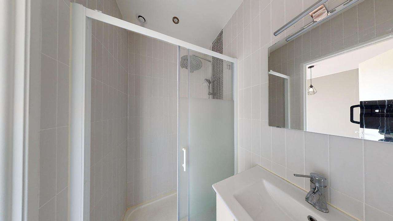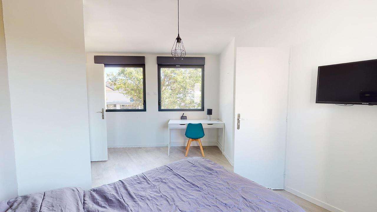 Chaque chambre dispose d’une salle de bain privative munie d’un meuble vasque et d’un WC et d’une douche. Les chambres disposent auusi d’un lit double, d’un bureau accompagné de sa chaise, d’une TV murale et d’un grand placard de rangement.
