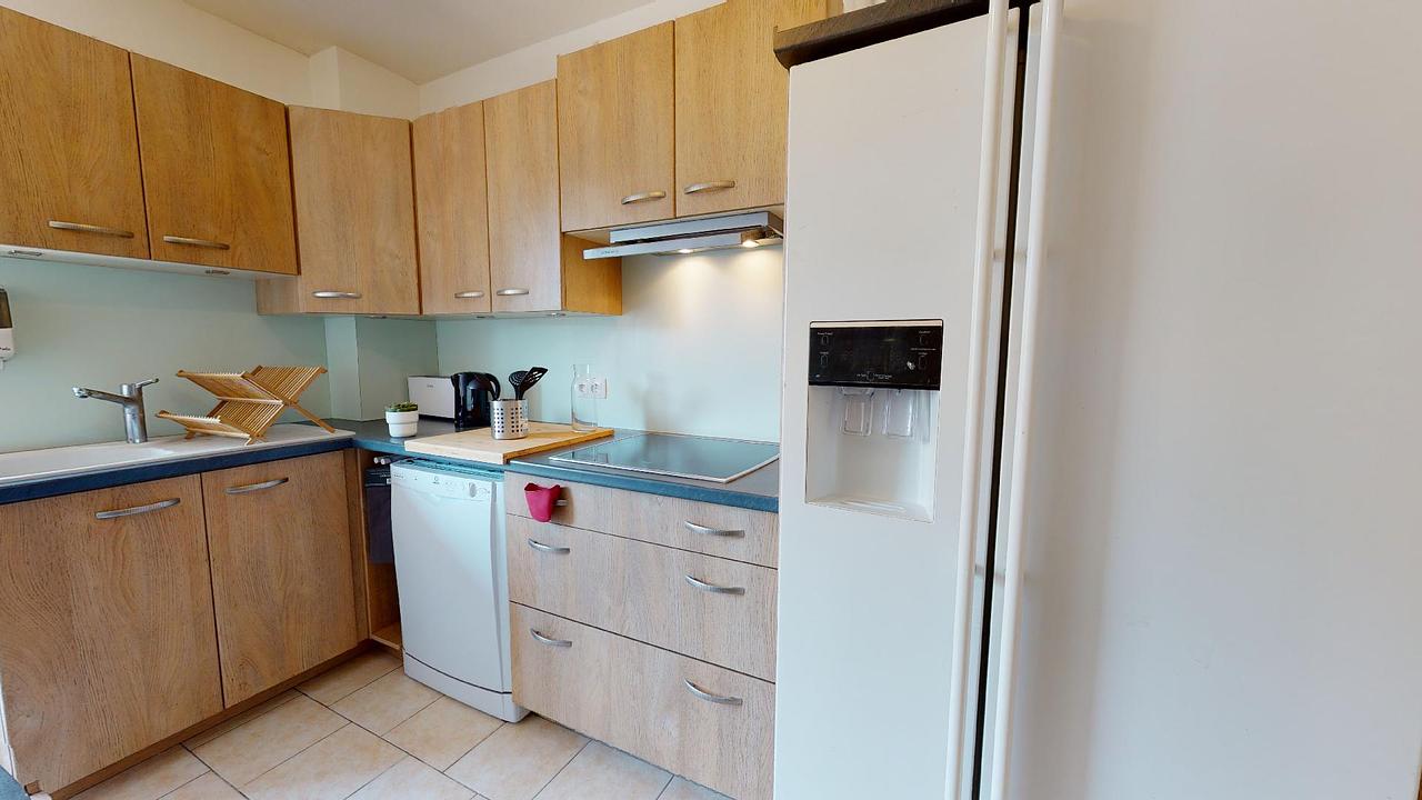 La cuisine quant à elle est séparée et entièrement équipée avec un four, un frigo américain, un lave-vaisselle, un micro-ondes, des rangements, etc.