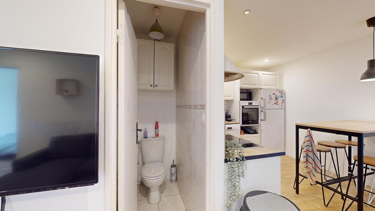 La salle de bain comprend une double vasque, un miroir, un lave-vaisselle et un sèche-serviette. Les toilettes sont séparées.