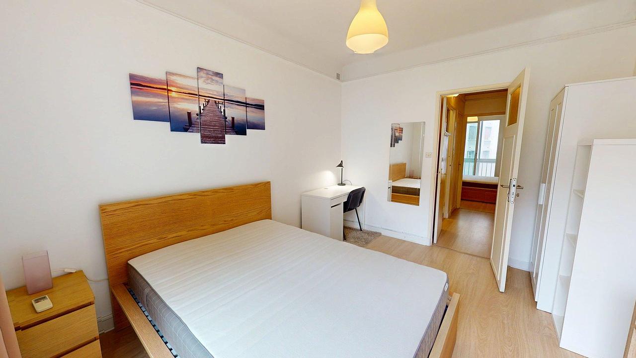 Première chambre (12,5 m²) : lit double, table de chevet, bureau, miroir, armoire et étagère. Elle donne accès au balcon.