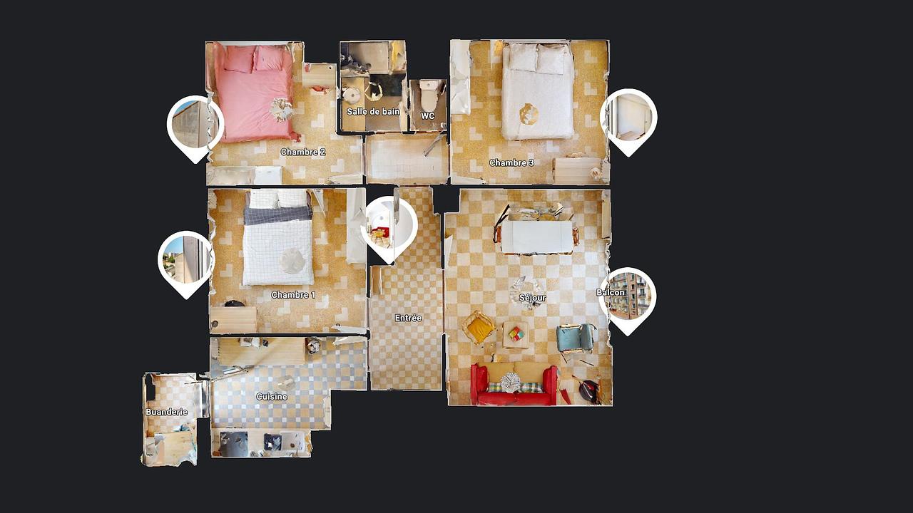L’appartement comporte trois chambres, un grand séjour avec balcon, une cuisine bien équipée (plaques de cuisson, four, frigidaire, rangement, etc.), une loggia faisant office de buanderie, une salle de bain et un WC indépendant.