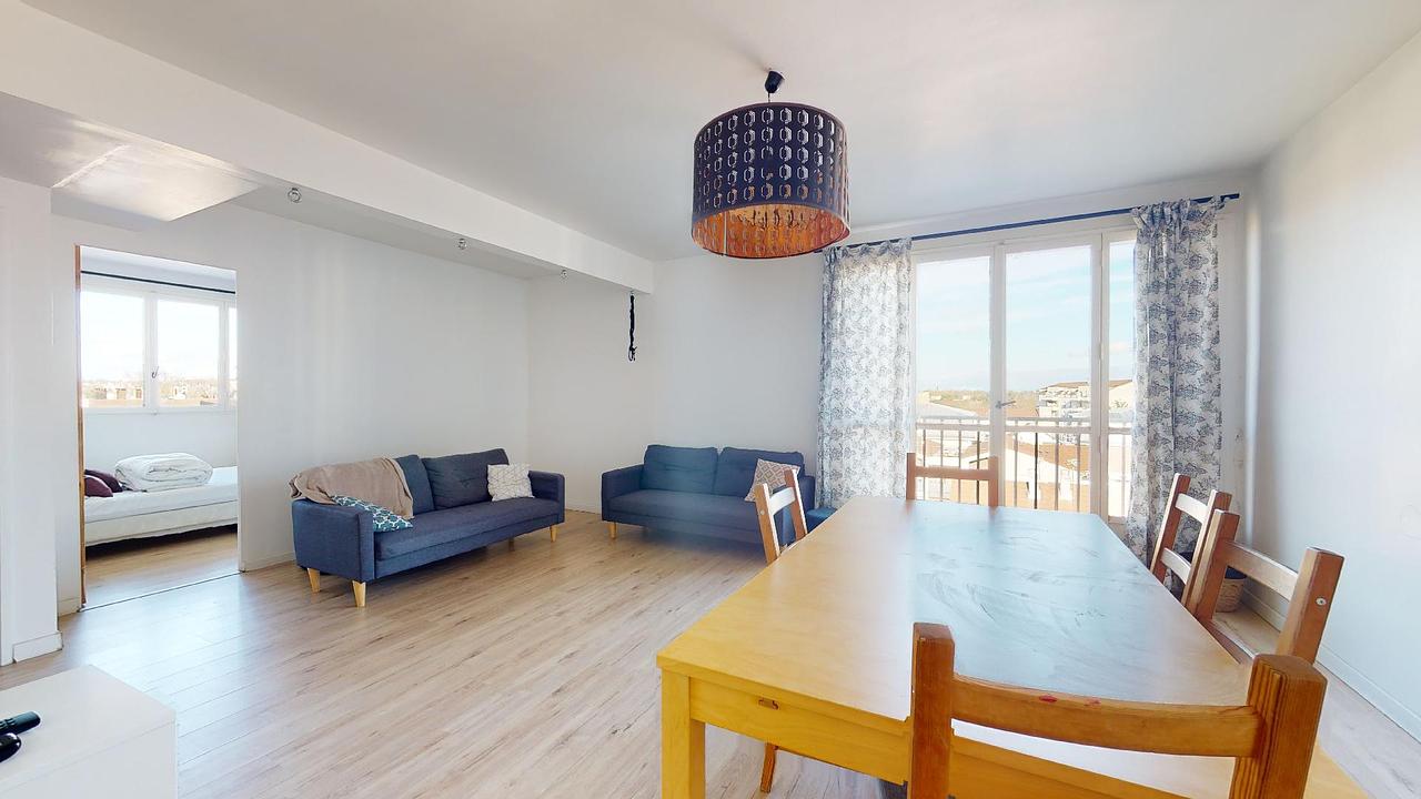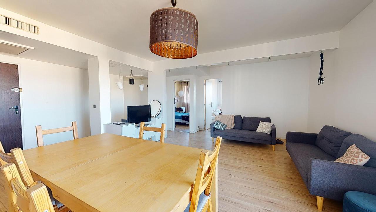 La salle à manger dispose d'une table avec cinq chaises, idéal pour partager un repas entre colocataire. Le spacieux et lumineux salon est aménagé de deux canapés, un meuble TV avec télévision ainsi qu'un pouf.