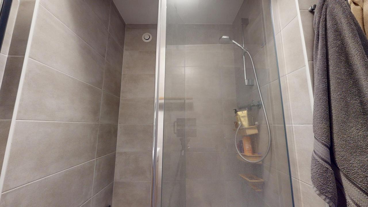 La seconde salle d'eau dispose d'une douche, d'un meuble vasque avec miroir et d'un espace de rangement supplémentaire.