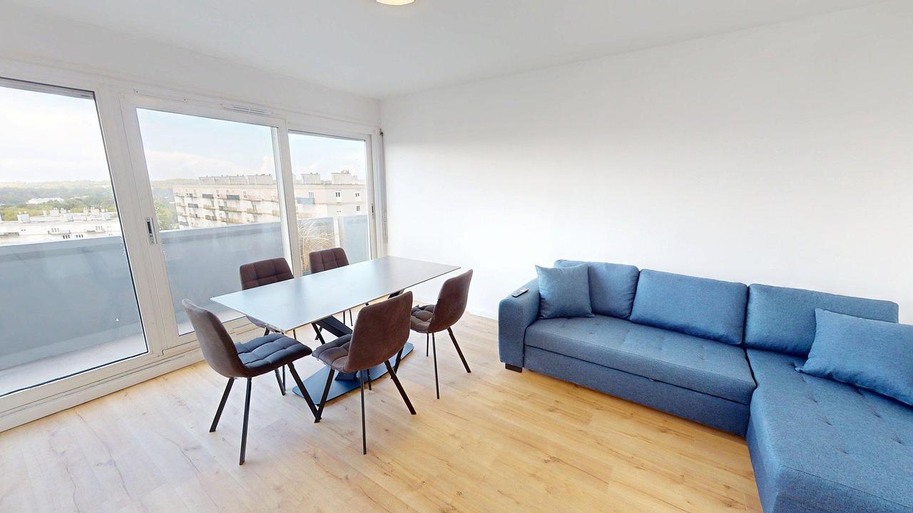 La pièce de vie est aménagée avec un canapé d’angle, une télévision murale et une table à manger avec 5 chaises. Elle s’ouvre sur un balcon offrant une vue dégagée.