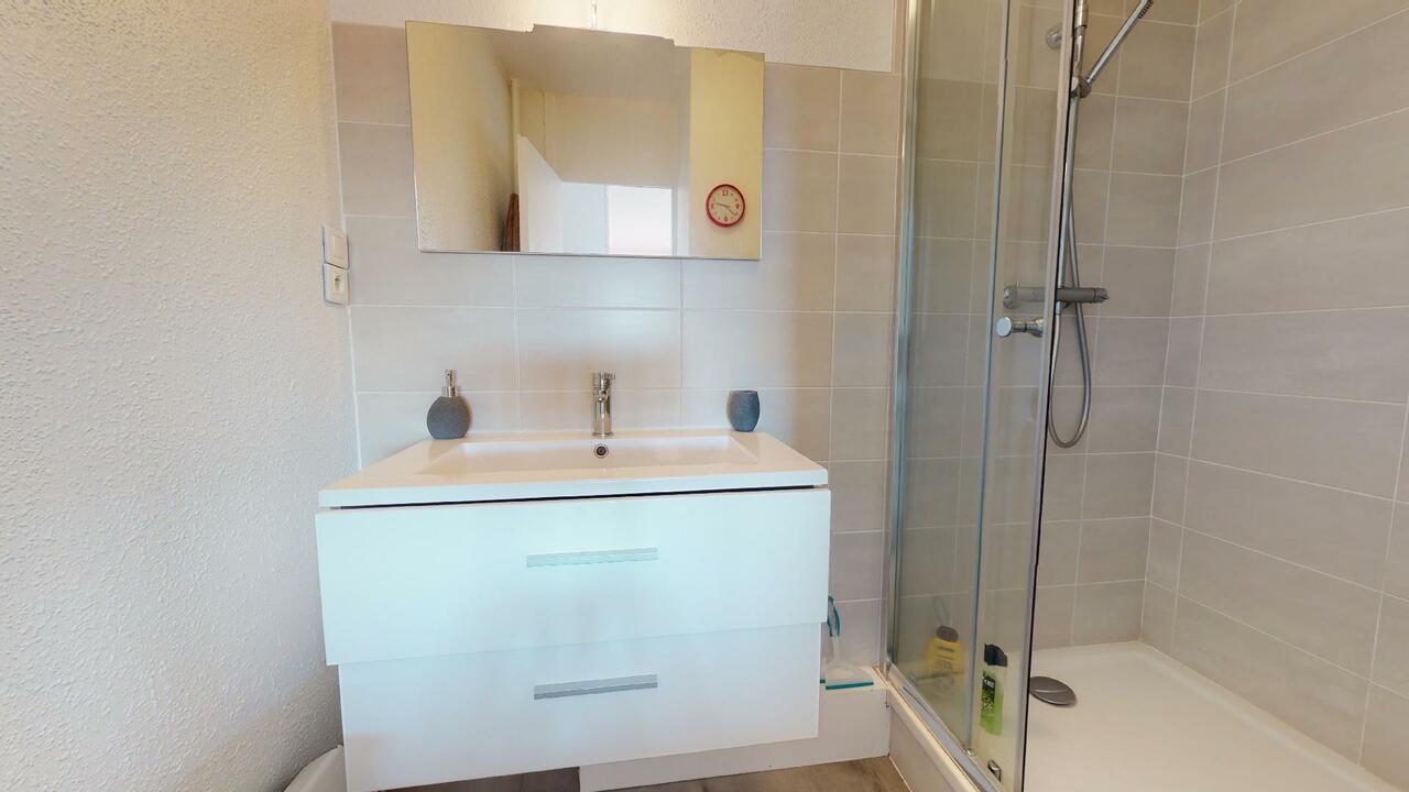 Une salle de bain moderne avec cabine de douche et meuble vasque ainsi que des WC séparés viennent compléter ce logement.