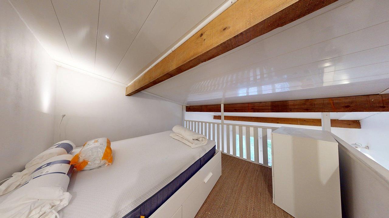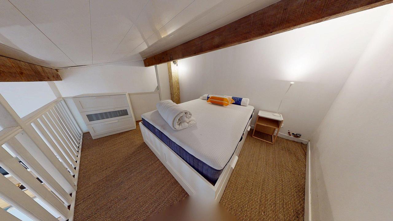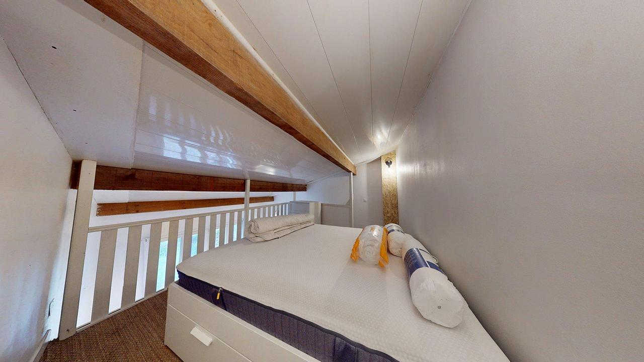 La chambre en mezzanine dispose d’un lit double, d’un placard et d’une table de chevet.