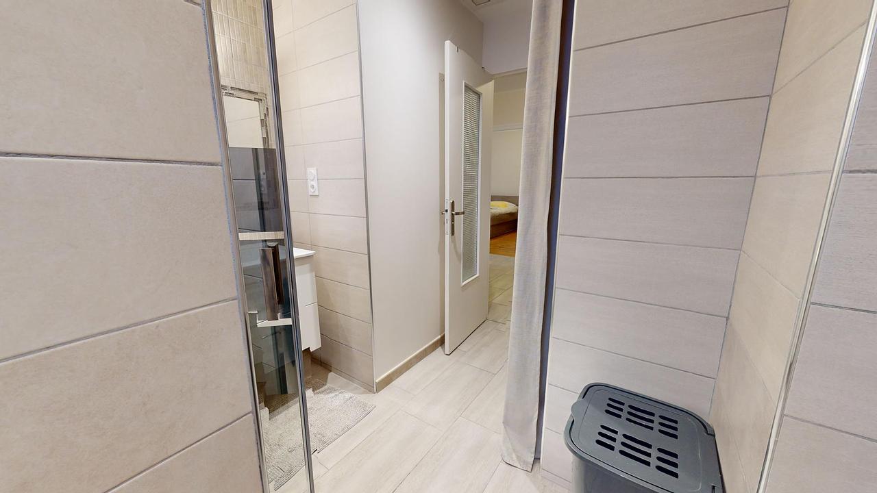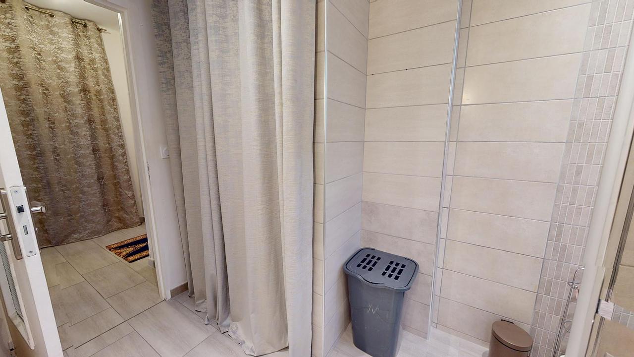 La salle d'eau dispose d'une grande douche, d'un meuble vasque avec un miroir, d'un sèche-serviettes, d'un WC ainsi que d'un placard mural.