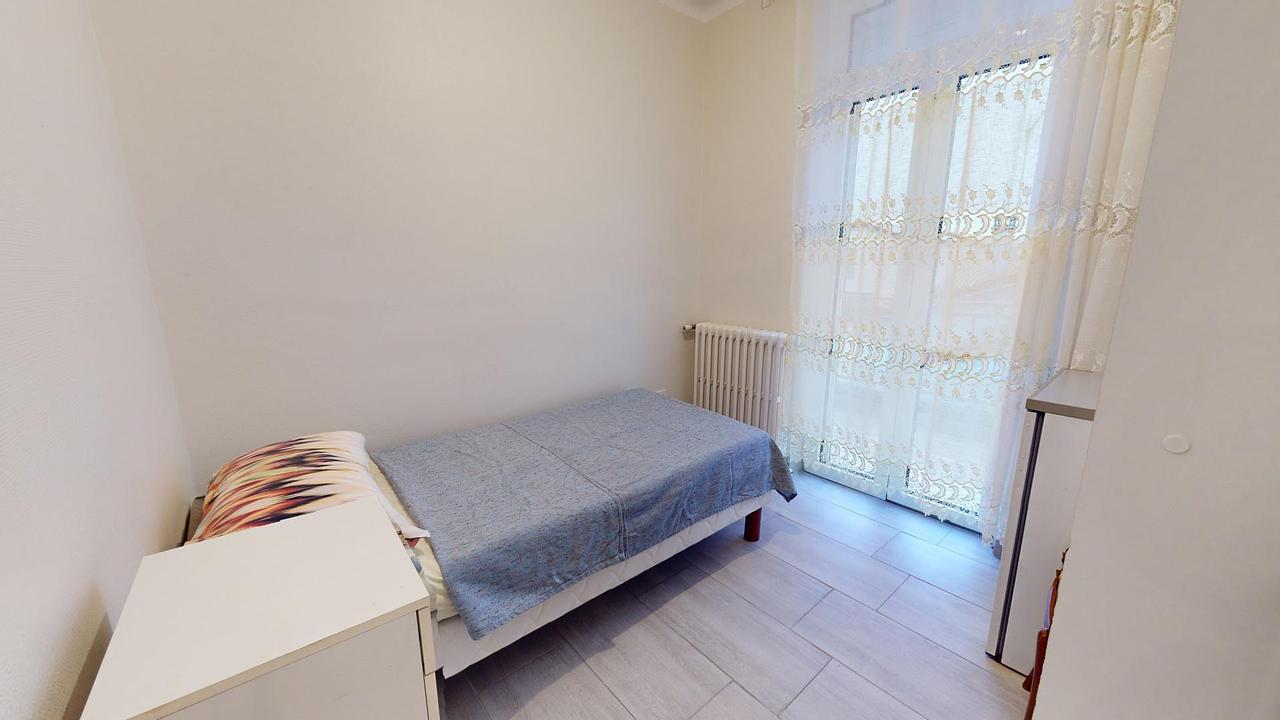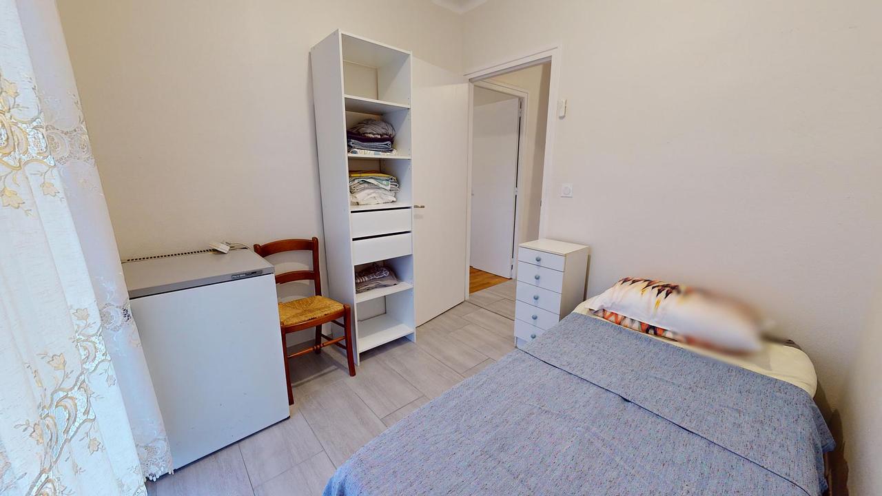 Cette colocation de trois chambres s'ouvre sur une entrée avec un meuble à chaussures et un placard mural. Le séjour est aménagé d'une table avec trois chaises, un réfrigérateur, un BZ, un meuble de rangements ainsi que d'une télévision.