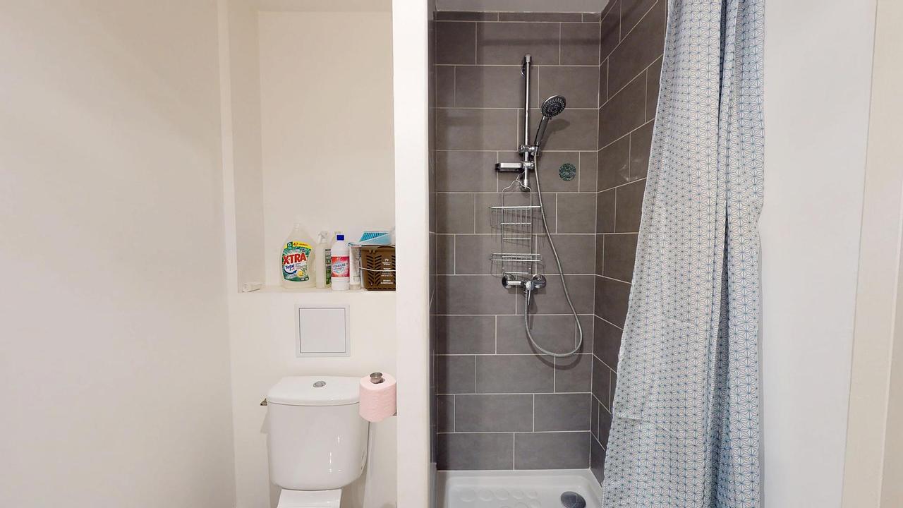 La salle d'eau comporte une douche, un meuble vasque avec miroir, un sèche-serviette, une machine à laver ainsi que des WC.