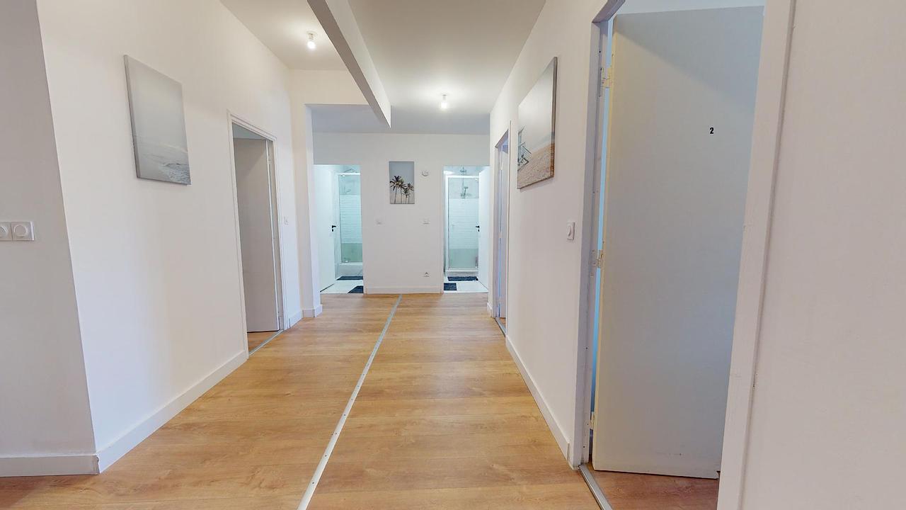 Deux salles de bain adjacentes situées au fond du couloir, la première avec douche, meuble vasque et WC et la deuxième avec douche, meuble vasque et WC viennent compléter ce logement.