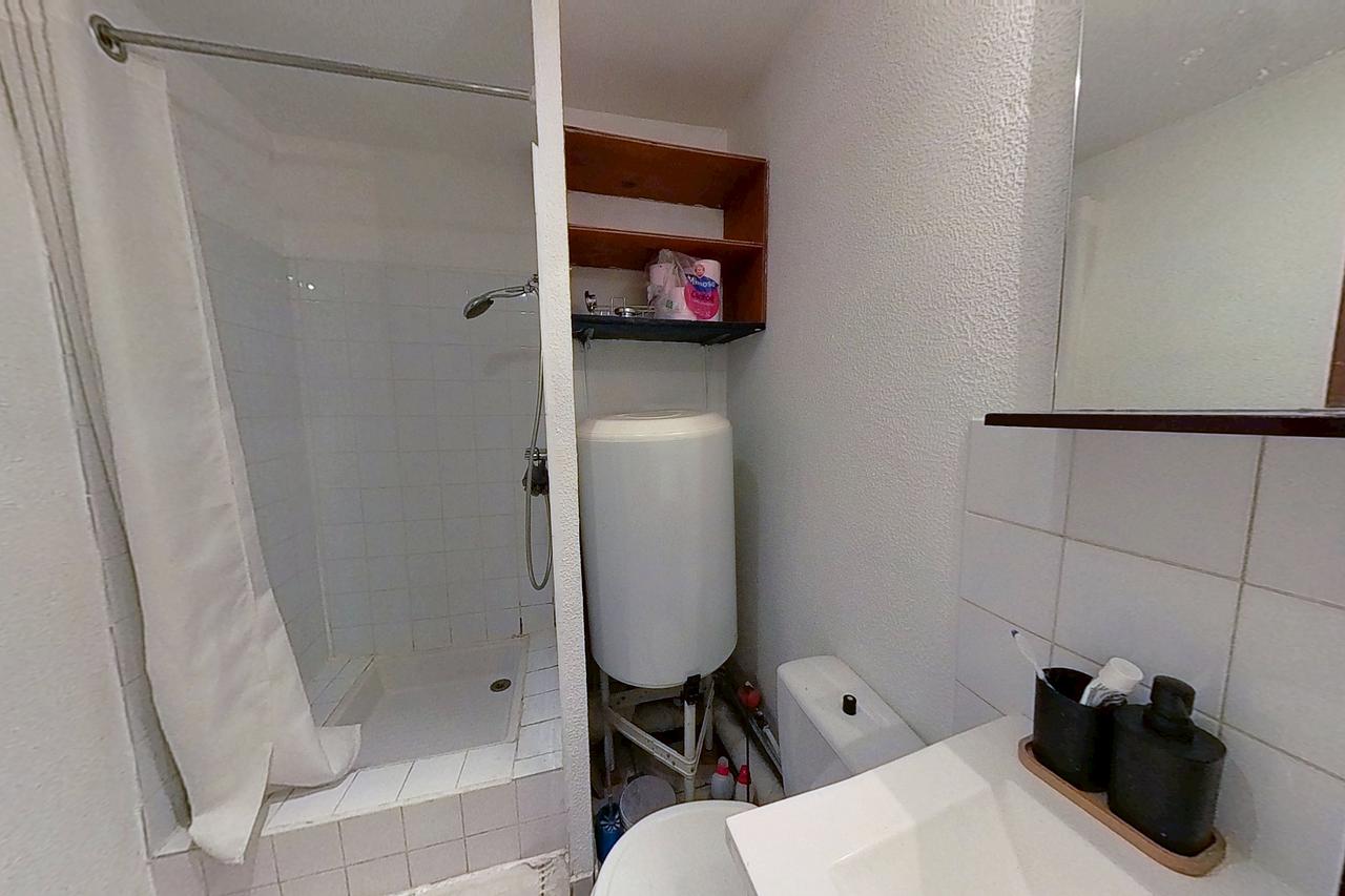La salle d'eau comporte une douche, un meuble vasque avec miroir, sèche-serviette ainsi que des rangements.
