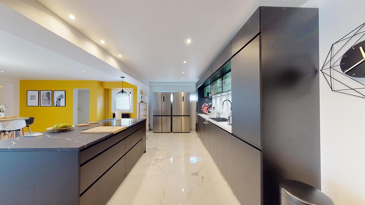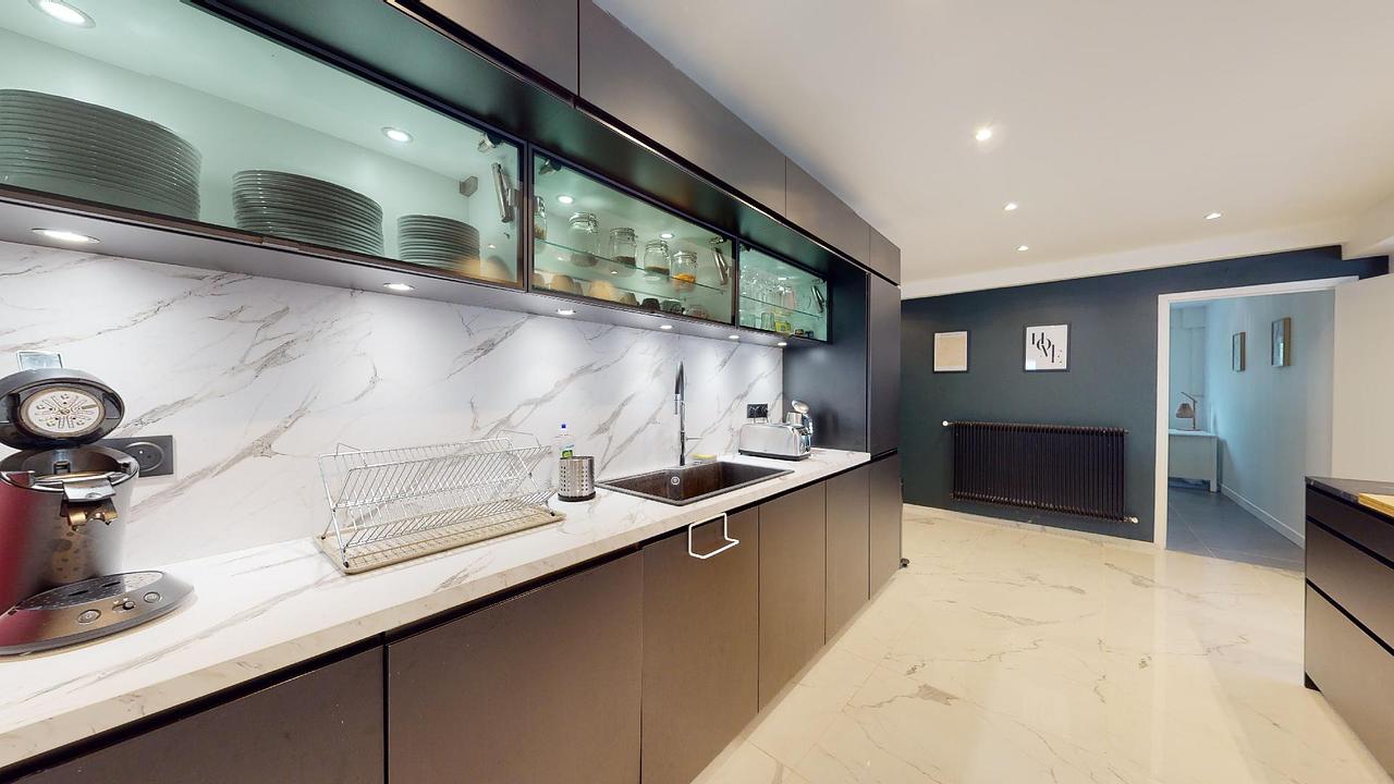 La pièce de vie dispose d’une cuisine entièrement intégrée et équipée (four, micro-ondes, frigidaires, tables à manger, plateau de travail, lave-vaisselle, etc.) et d’un lumineux salon agencé avec du mobilier de standing (Meuble TV, TV, canapés, ensemble de tables basse, fauteuils, etc). Ces espaces s’ouvrent sur une belle terrasse, son salon d’été et le jardin. Enfin, les salles d’eau du logement sont communes et disposent toutes d’un meuble vasque et d’une douche.