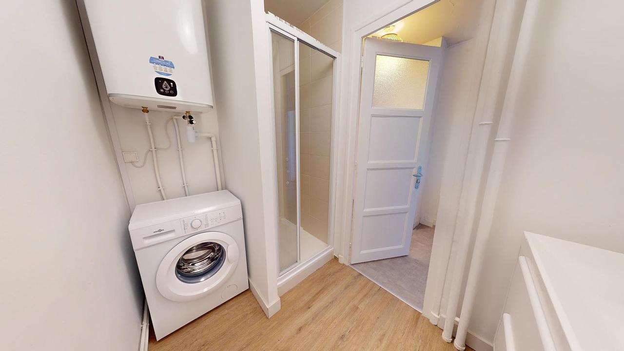 - D'une salle de bain, équipée d'une douche, d'un meuble vasque et d'un lave-linge.