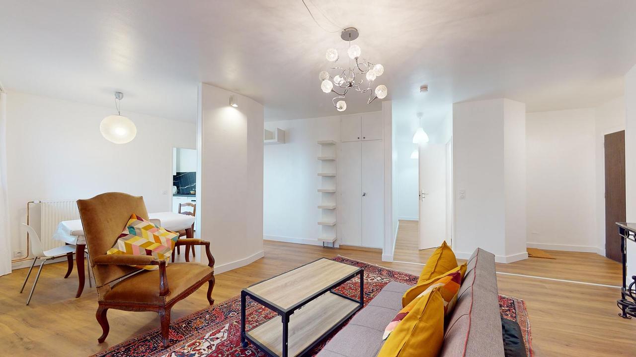 Il possède une belle pièce de vie meublée avec canapé, table basse, tapis, fauteuil et rangements. Une table à manger est aussi présente. La cuisine, séparée,