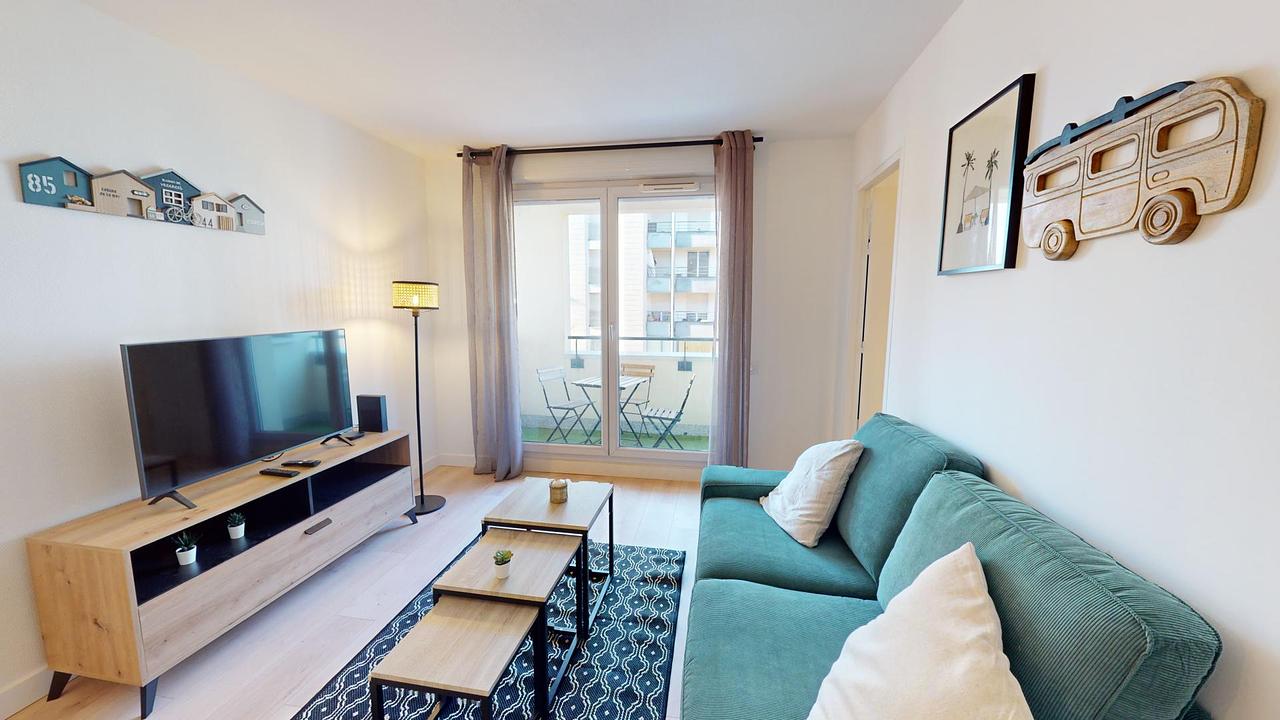 Elle donne sur un balcon aménagé avec une petite table d'extérieur.