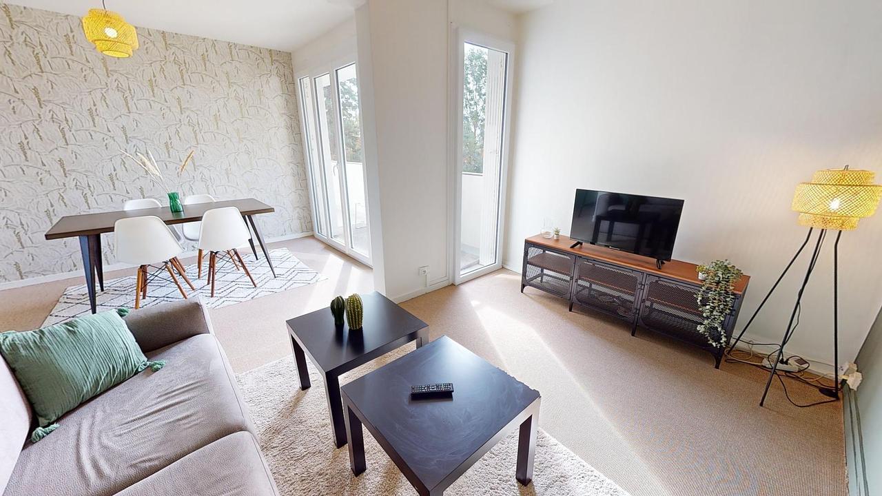 Le logement meublé et rénové propose une belle pièce de vie avec table à manger 6 places, canapé, table basse, TV et meuble TV. Le tout rénové avec goût. L'espace de vie donne grâce à une belle porte fenêtre sur un balcon, déjà équipé d'une table à manger 2 personnes.
