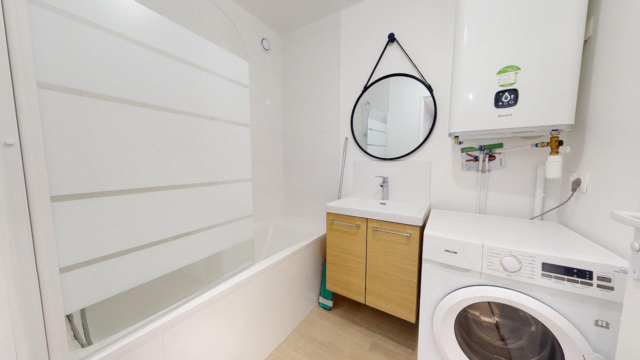 La cuisine est très bien équipée et dispose d’un four, de plaques de cuisson, d’une hotte, d’un grand frigidaire, de nombreux rangements et dispose aussi d’une machine à laver. Les deux salles de bain du logement sont communes et se munissent d’un meuble vasque et d’une douche.