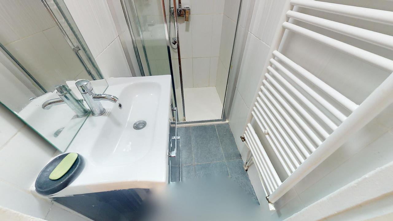 La salle de bain est munie quant à elle, d’un meuble vasque, d’une douche et d’un sèche serviette.