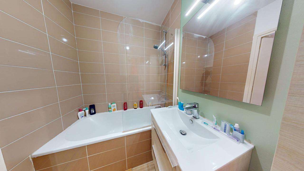 Cette colocation de trois chambres s'ouvre sur une entrée avec un porte-manteau ainsi que d'un grand placard mural.