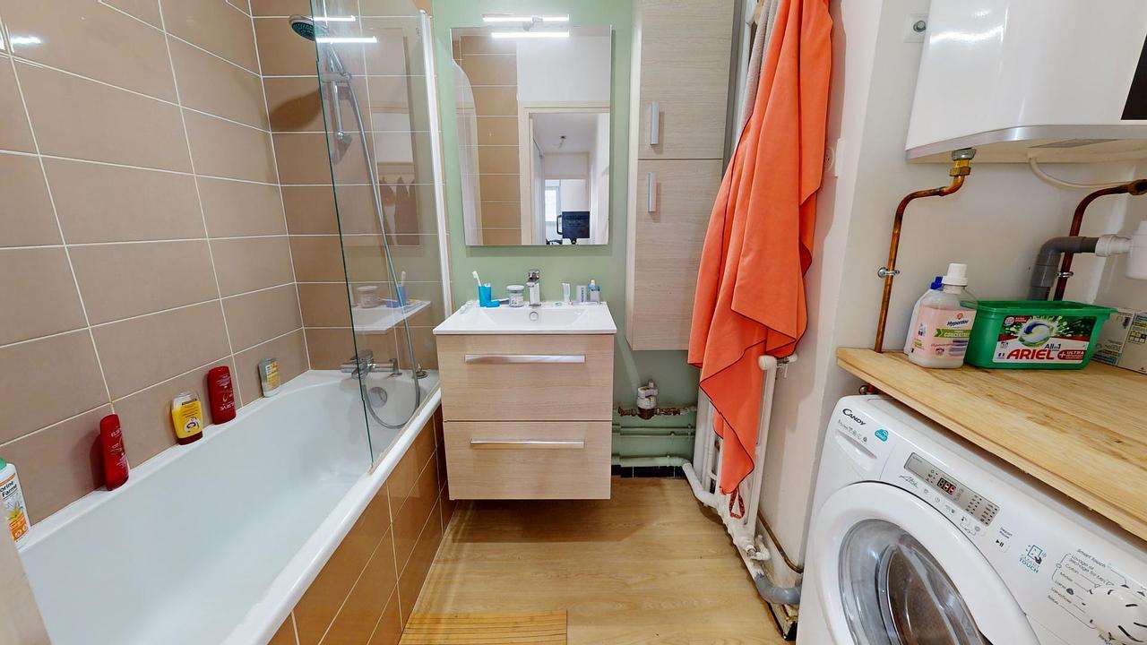 La salle de bain dispose d'une baignoire, d'un meuble vasque avec un miroir ainsi que d'une machine à laver. Les toilettes sont séparées.