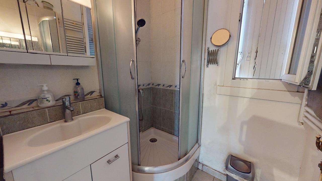 Cet appartement de 4 pièces comporte trois chambres, une cuisine avec un four, un lave-vaisselle, un micro-ondes ainsi qu'une plaque de cuisson et une salle de bains équipée d'une douche ainsi que d'un meuble vasque.