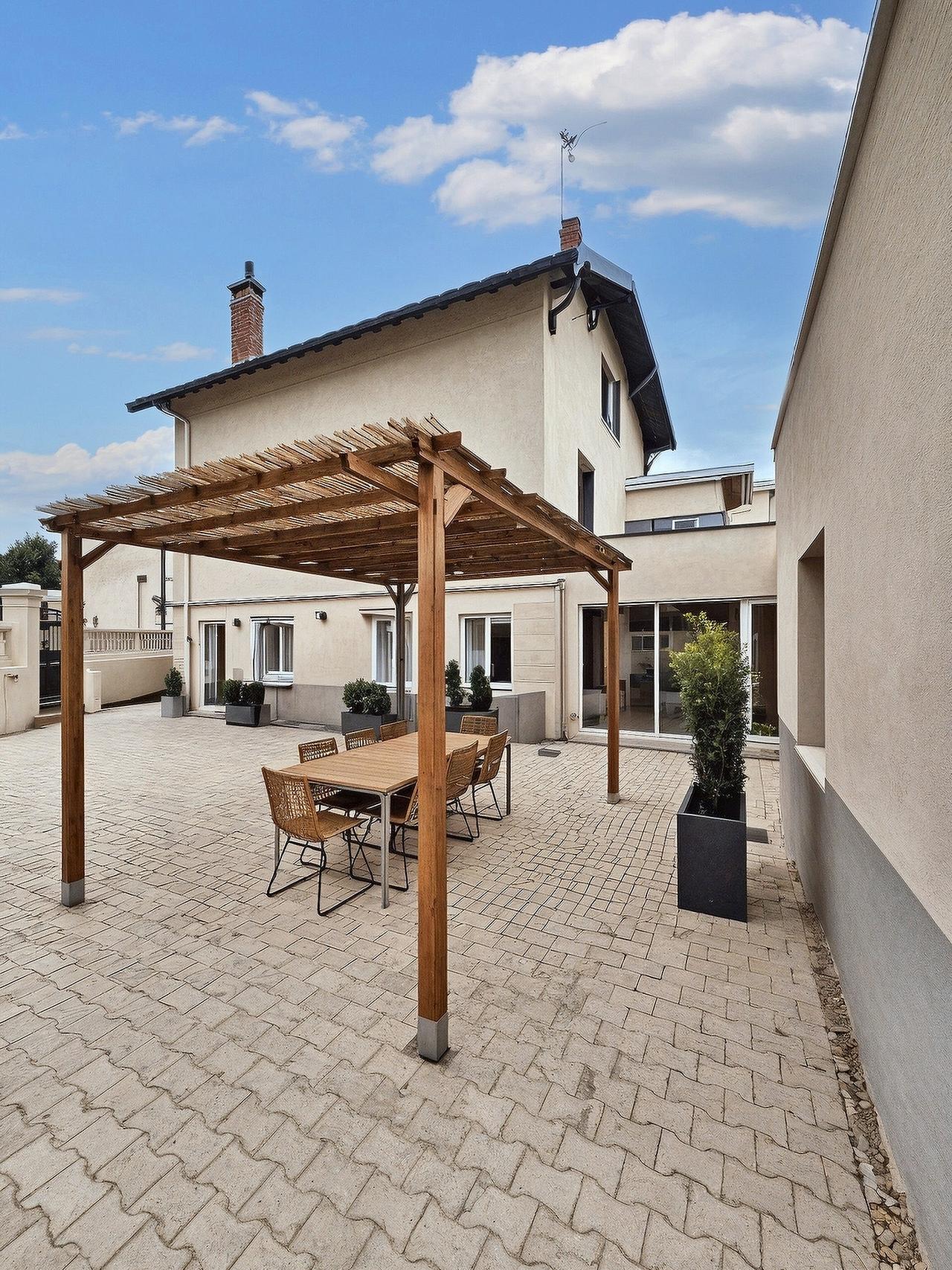 Cet espace de coliving est agrémenté d'une cour intérieure, bientôt arborée, disposant d'une table à manger et de sept chaises.