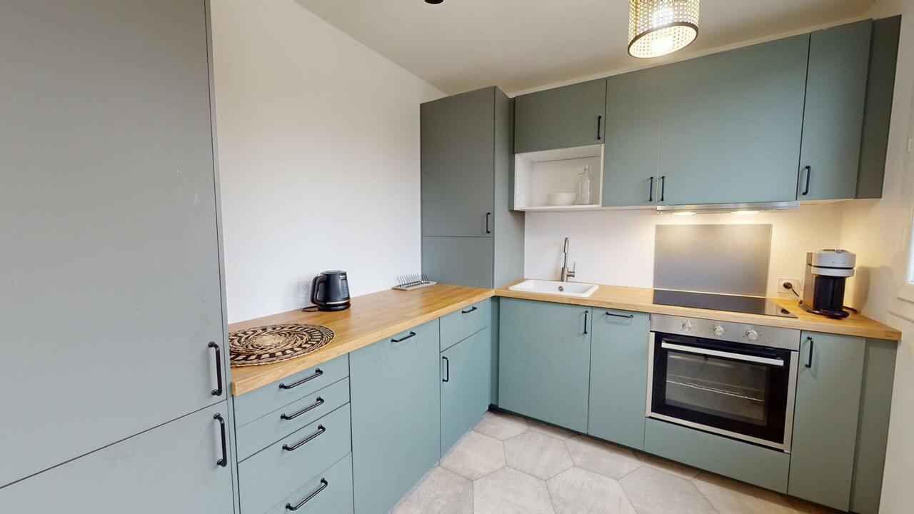 La cuisine est meublée d'un meuble de rangement. Elle comporte également un four, un lave-vaisselle, une machine à café, un micro-ondes et une plaque de cuisson.