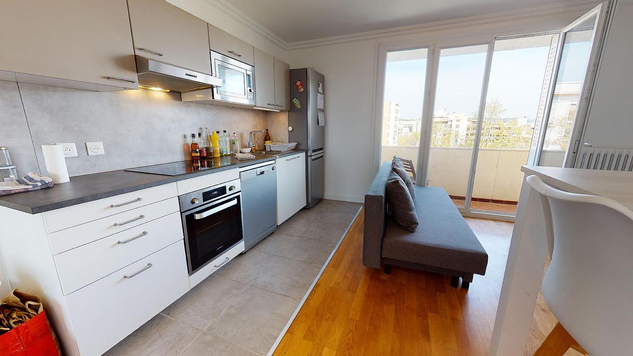 Grande colocation à Villeurbanne de 5 chambres pour 102 m². L’appartement est situé au 66 bis avenue Roger Salengro, au 6e étage d’une résidence.