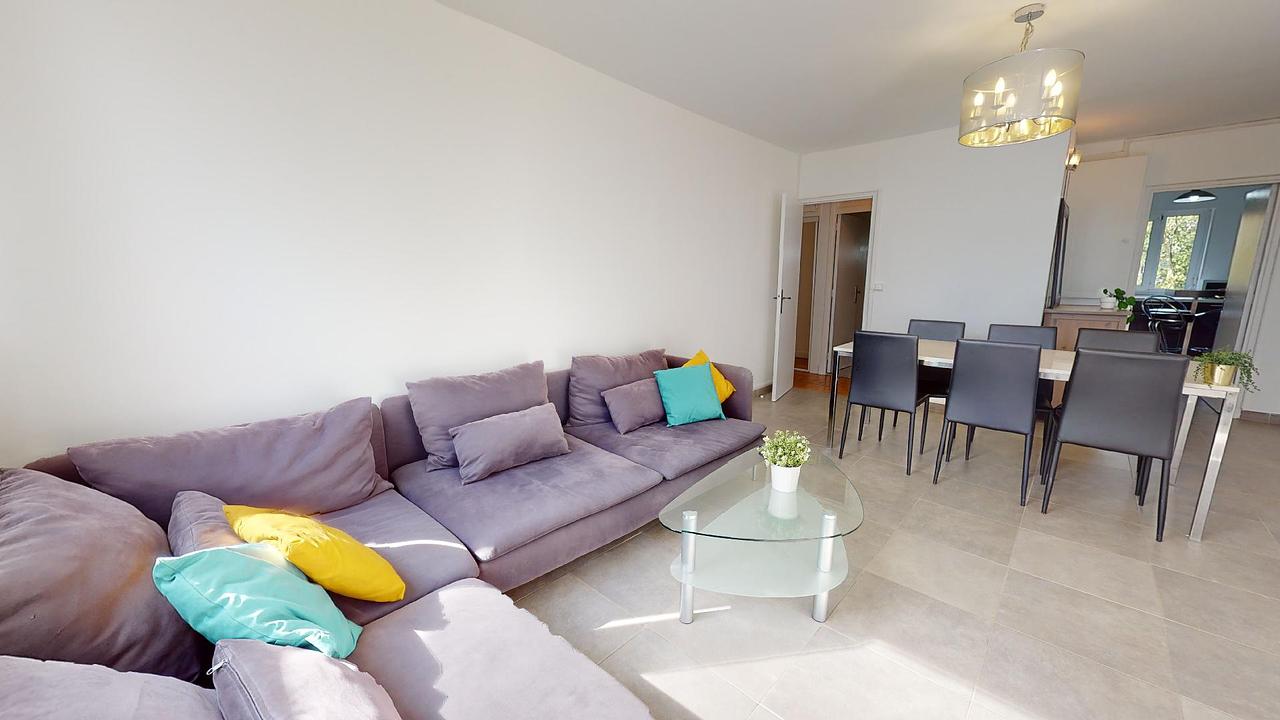 L'appartement possède une belle pièce de vie avec table à manger, et coin salon avec canapé d'angle, TV et meuble TV et table basse.