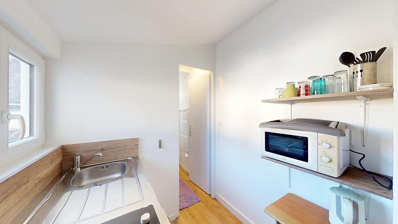 Ce studio fonctionnel se compose d'une pièce principale lumineuse comprenant un espace de vie avec bureau et rangements. Le coin cuisine est entièrement équipé avec des plaques de cuisson, un réfrigérateur et un micro-ondes. L'appartement dispose également d'une salle d'eau privative avec douche, meuble vasque et WC.