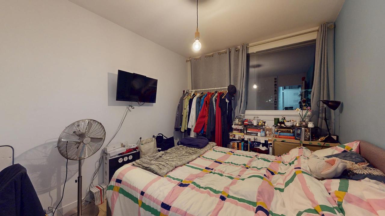 Cette chambre est très lumineuse en journée grâce aux grandes fenêtres, elle dispose d'un lit double, d'un bureau, d'une télévision, d'une salle de bain privative et de beaucoup de rangements.