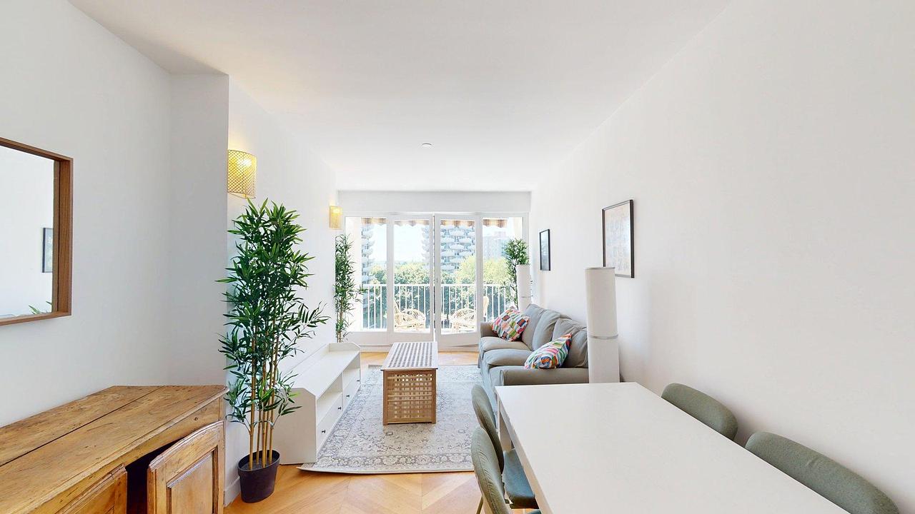 La pièce de vie est meublée avec un canapé, une table basse, un meuble télévision, un buffet ainsi qu'une table à manger et ses 5 chaises. Le salon possède un accès direct au balcon avec ses deux fauteuils, ce qui permet de profiter pleinement de l'extérieur.