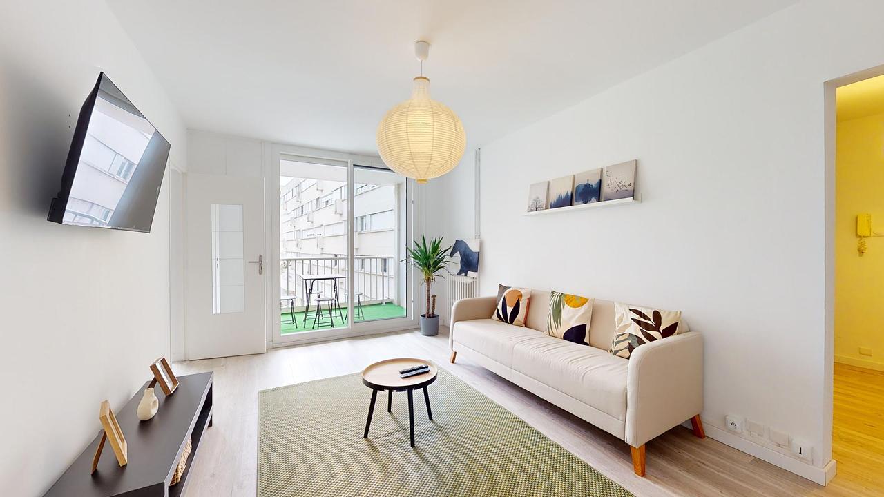 Le logement meublé possède un séjour idéalement meublé avec TV murale, meuble TV, canapé, chaises et éléments de décoration. Il donne sur un balcon équipé avec petite table à manger d'extérieur et chaises.